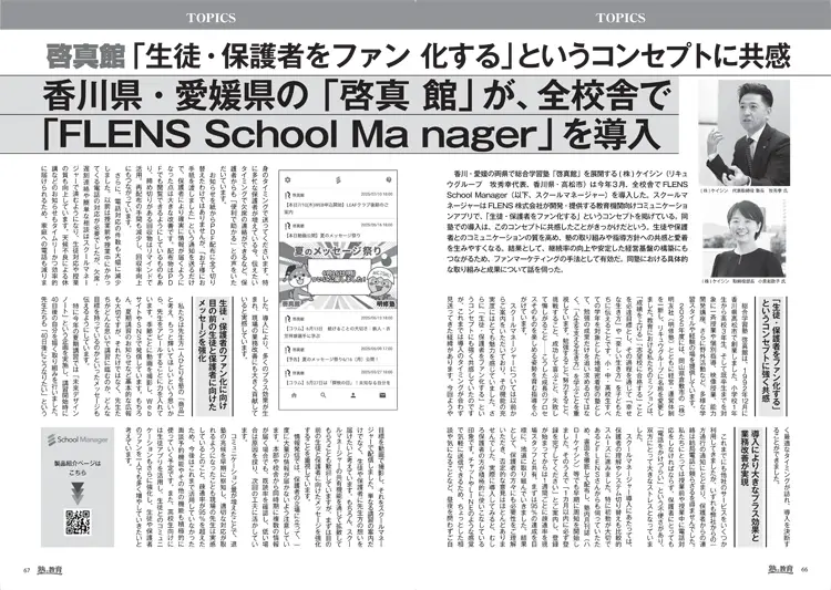 【啓真館様】『塾と教育2025年10月号掲載』「生徒・保護者をファン化する」というコンセプトに共感 香川県・愛媛県の「啓真館」が、全校舎で「FLENS School Manager」を導入