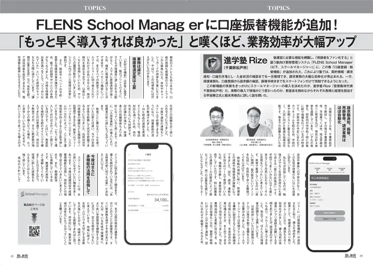 【進学塾Rize様】『塾と教育2025年9月号掲載』FLENS School Managerに口座振替機能が追加! 「もっと早く導入すれば良かった」と嘆くほど、業務効率が大幅アップ